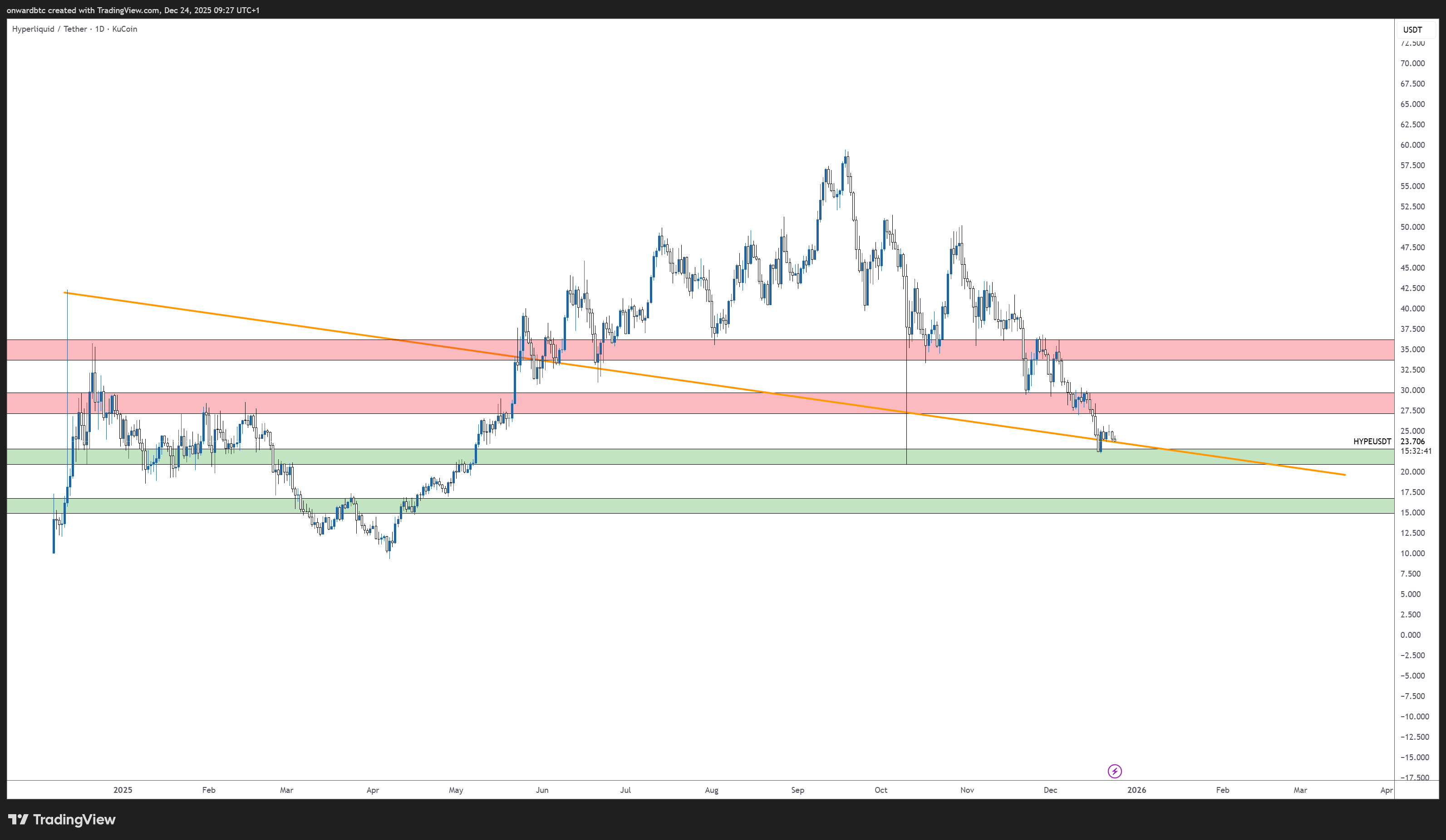 Analysts note that if HYPE breaks below $22.27 (Fibonacci swing low), further liquidations could cascade. The $21 level is described as the critical breakdown point. A bullish breakout above $36 (falling wedge resistance) could force short squeezes, but failure to hold support risks accelerated selling.