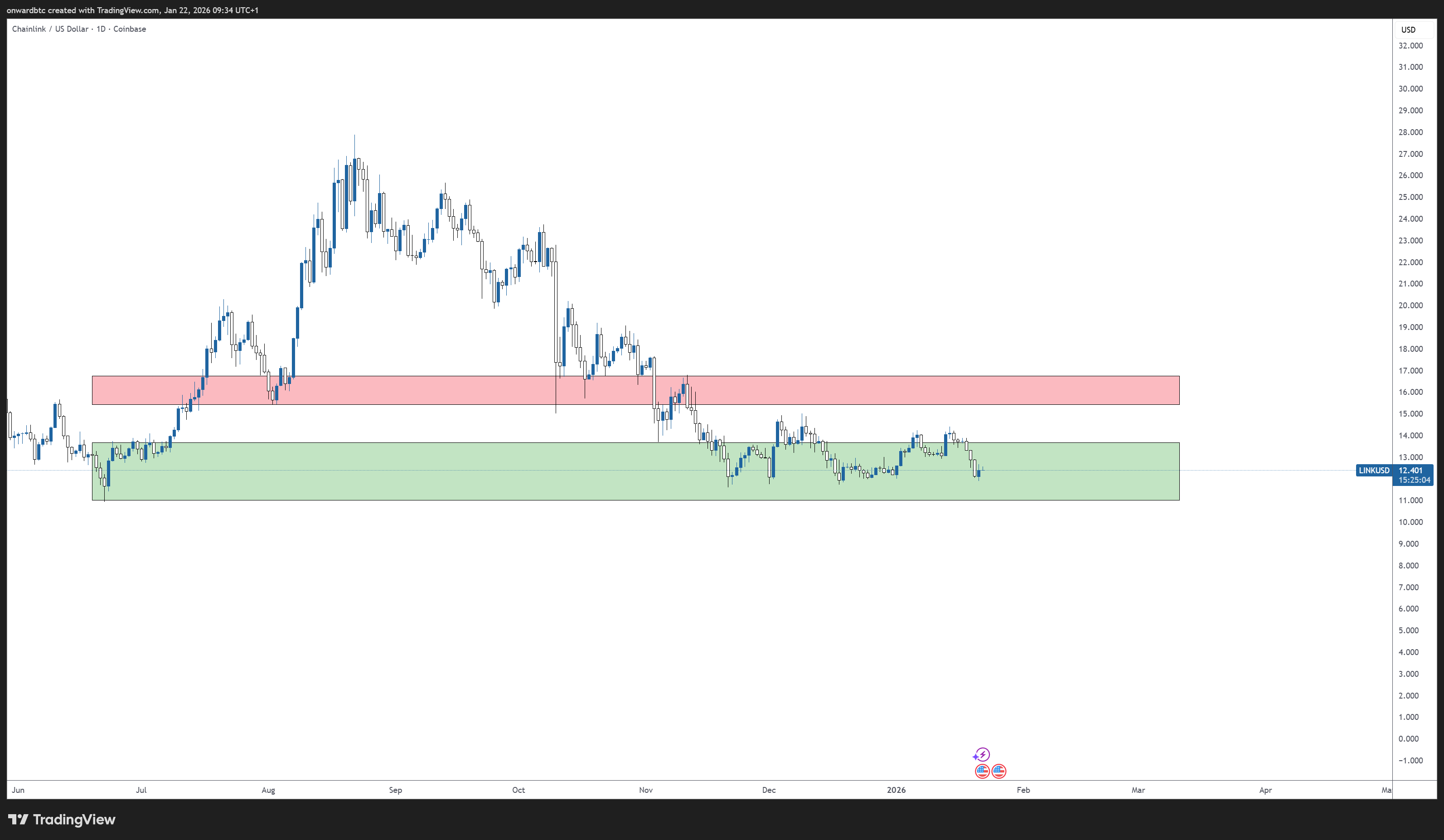 Freya also noted that LINK closed indecisively multiple times and needs LINKBTC to show strength for sustained momentum. The $14.20 level is critical: staying above it indicates bullish momentum, while falling below could extend sideways trading.