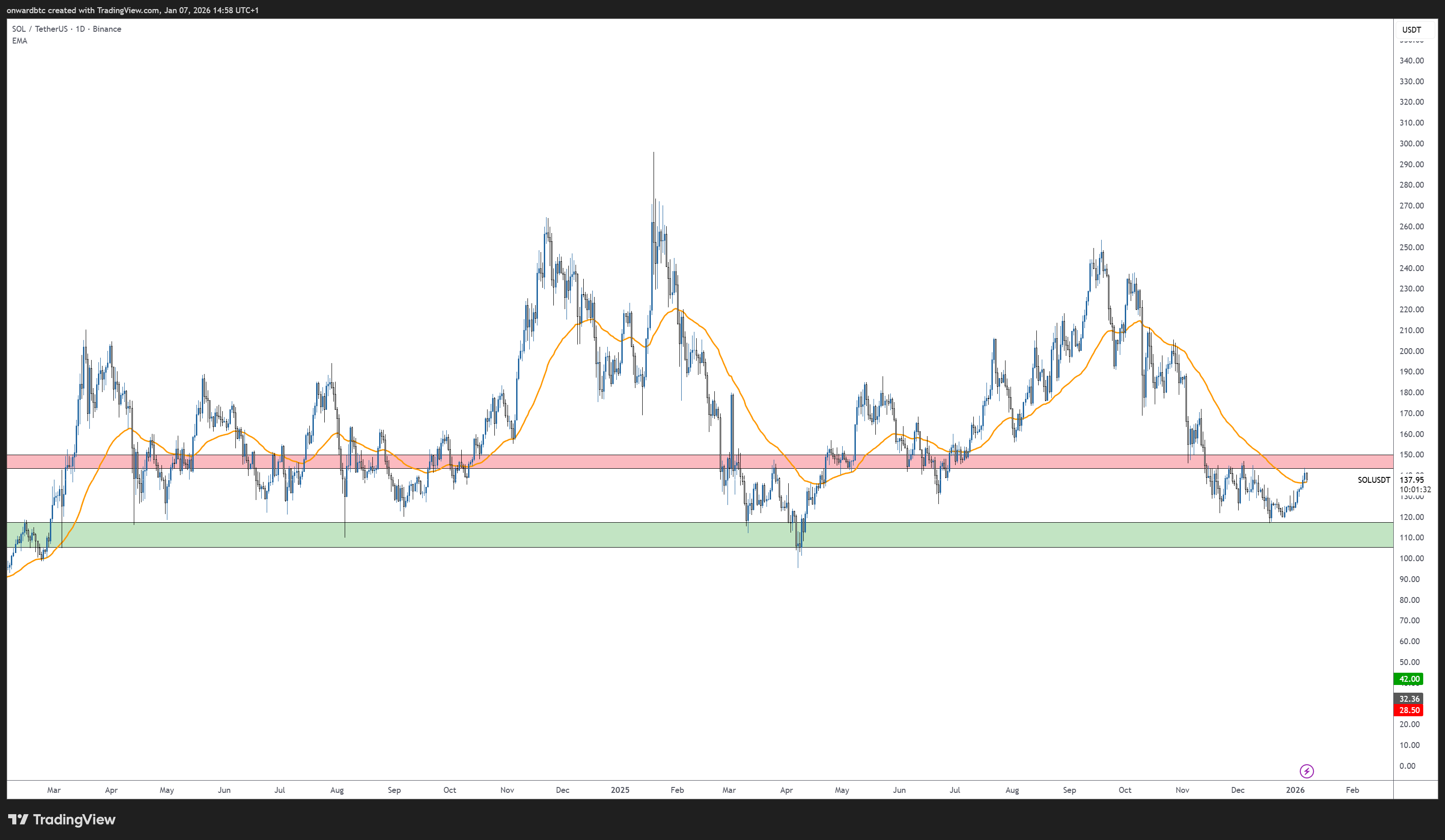 The 50-day EMA at $137 is providing near-term support. Play the range between $135 support and $143 resistance for quick scalps. Be aware of the crowded long positioning, as any break of support could trigger cascading liquidations. Size down and use tight stops.