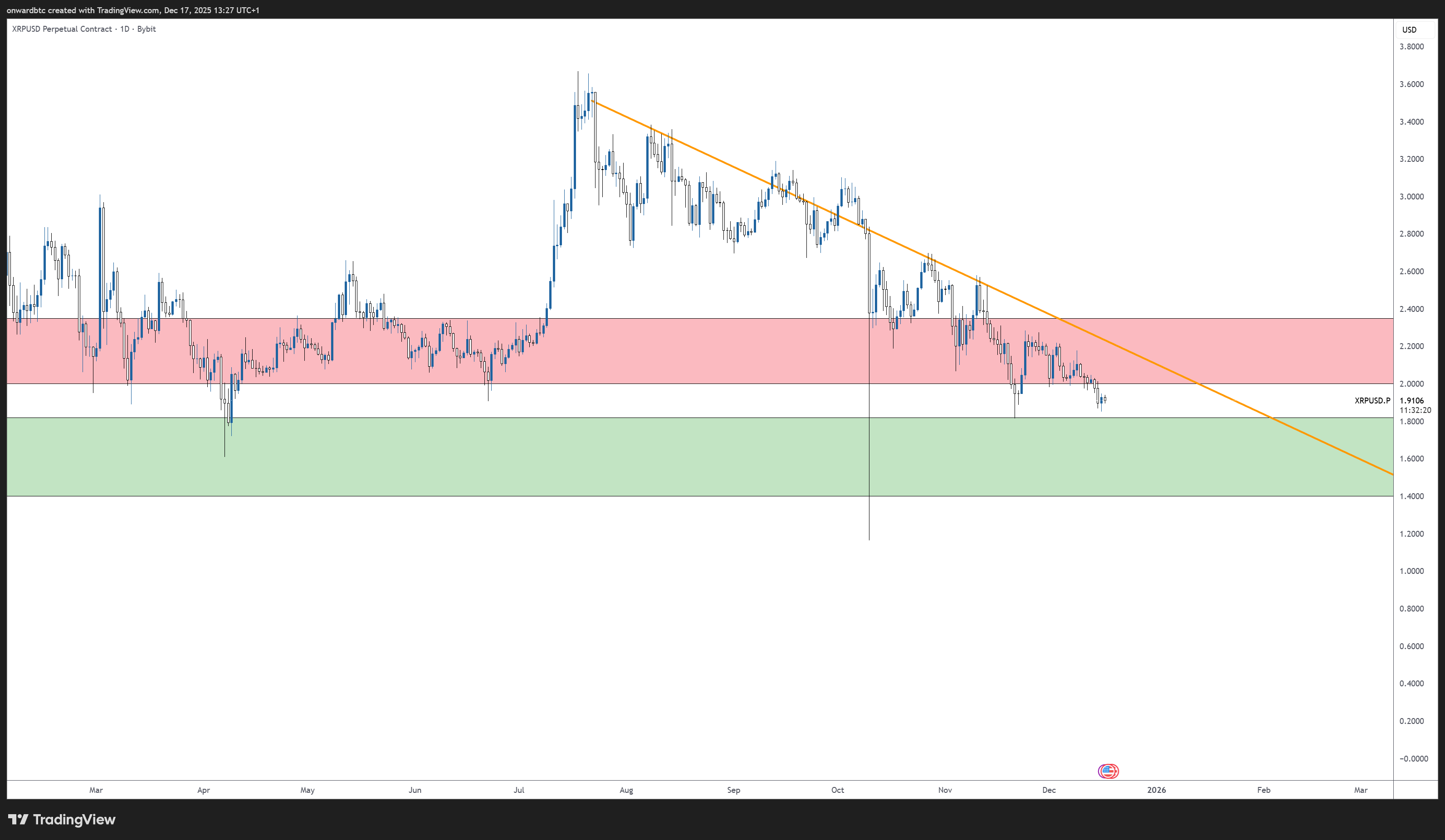 The $2.00 psychological level and $2.10 resistance provide clear rejection points for shorts. The $1.82-$1.90 zone offers bounce plays. Funding rates are compressed, which means less crowded positioning. Size down during thin year-end liquidity.